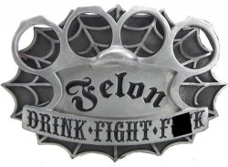 Brand NEW! - Official Felon Clothing Drink*Fight*F@#K Belt Buckle Bottle Opener with Money Clip.Spider Web, Brass Knuckles Dusters, Bottle Opener in the Front. Holds Condoms or Cash with the Money Clip on the back.